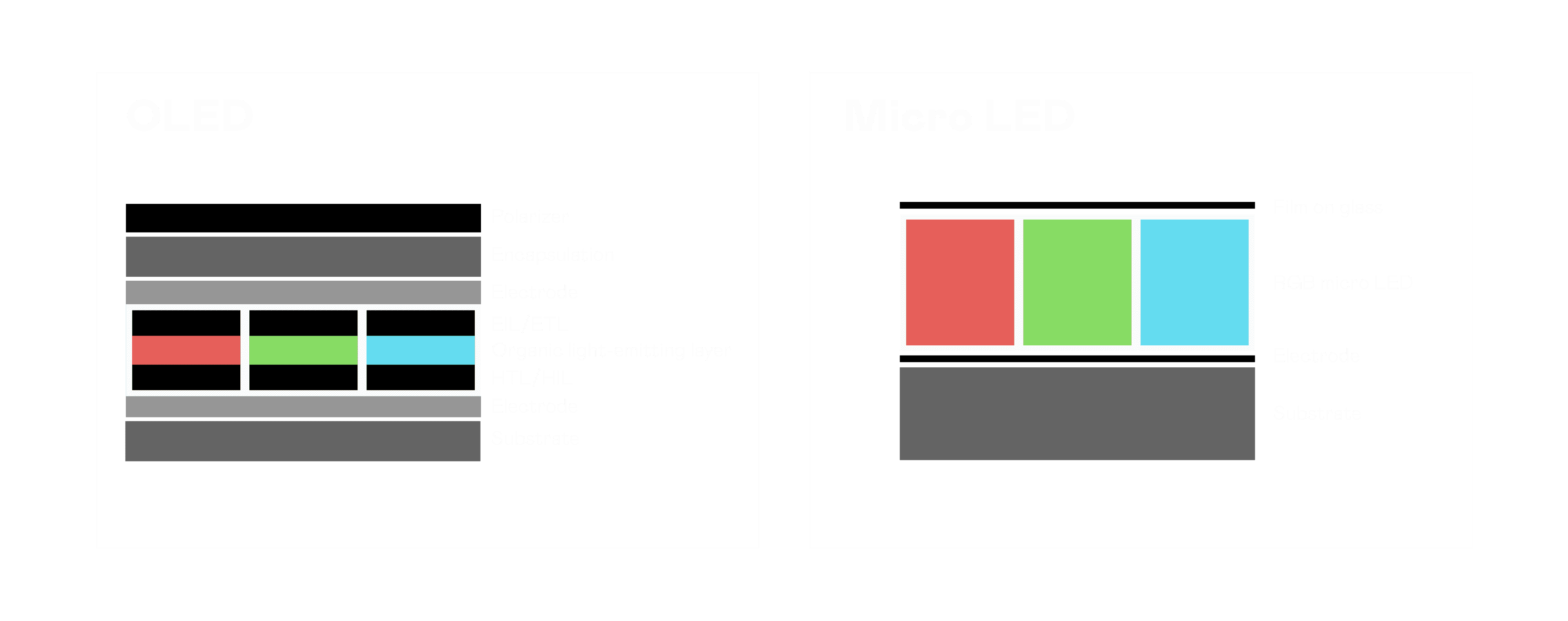 以 LED 做为显示画素,,,可让 LED 的发光效率发挥到极致,,,,从而让显示器具备优异的亮度表现,,不论是在户外或室内,,,均具备出众的显示效果。。。。同时,,与使用有机材料的 OLED 相比,,,,LED 具备更稳定、、、、寿命更长的特性,,不仅不会有画面烙印问题,,而且更不容易出现故障、、、、坏点。。。