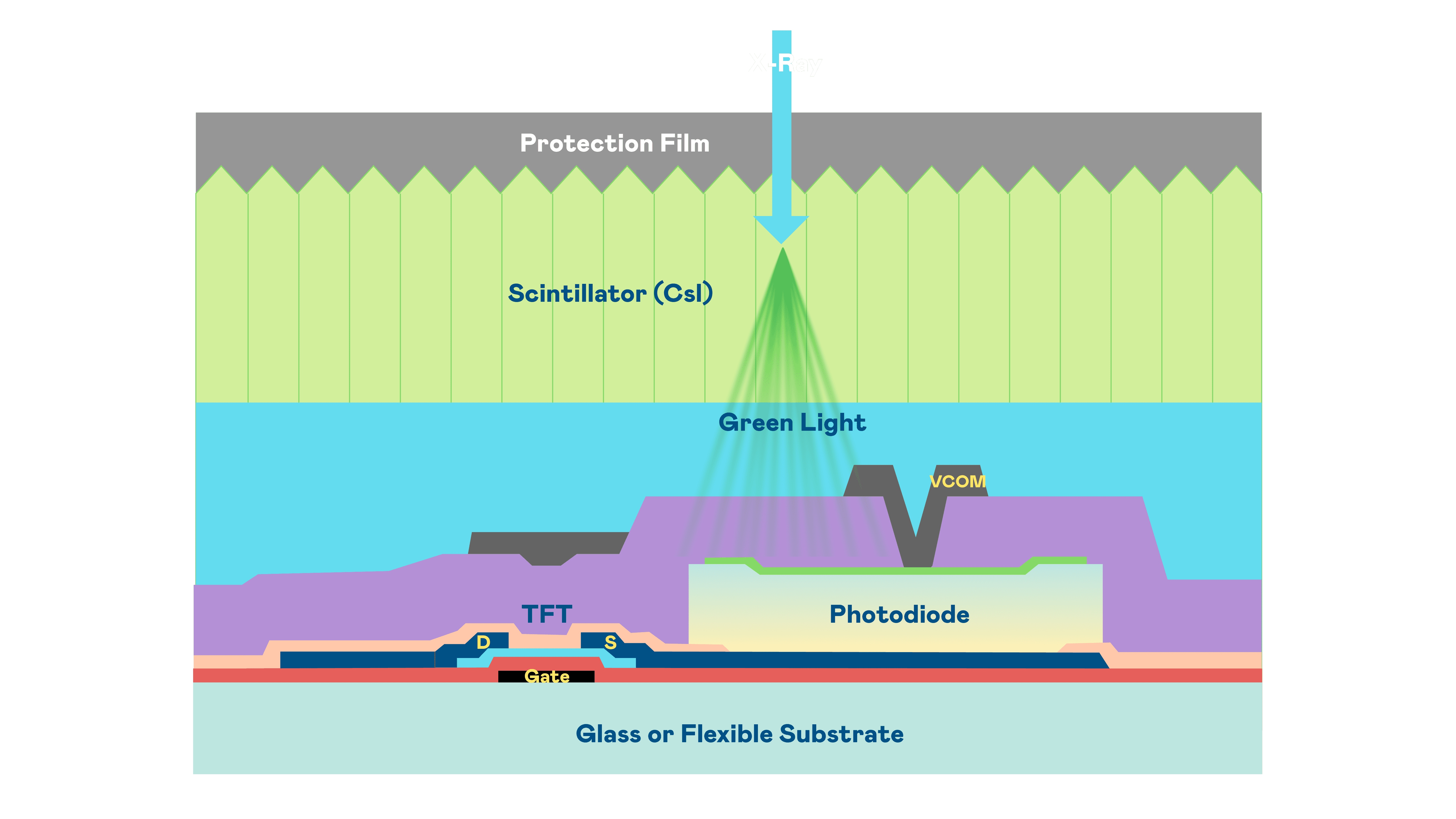 Wepay的X光影像感测阵列使用薄膜电晶体 (TFT) 作为每个像素的读取开关,,,搭配光电二极体(Photodiode)的光电转换元件,,,,用以感测X光影像讯号。。