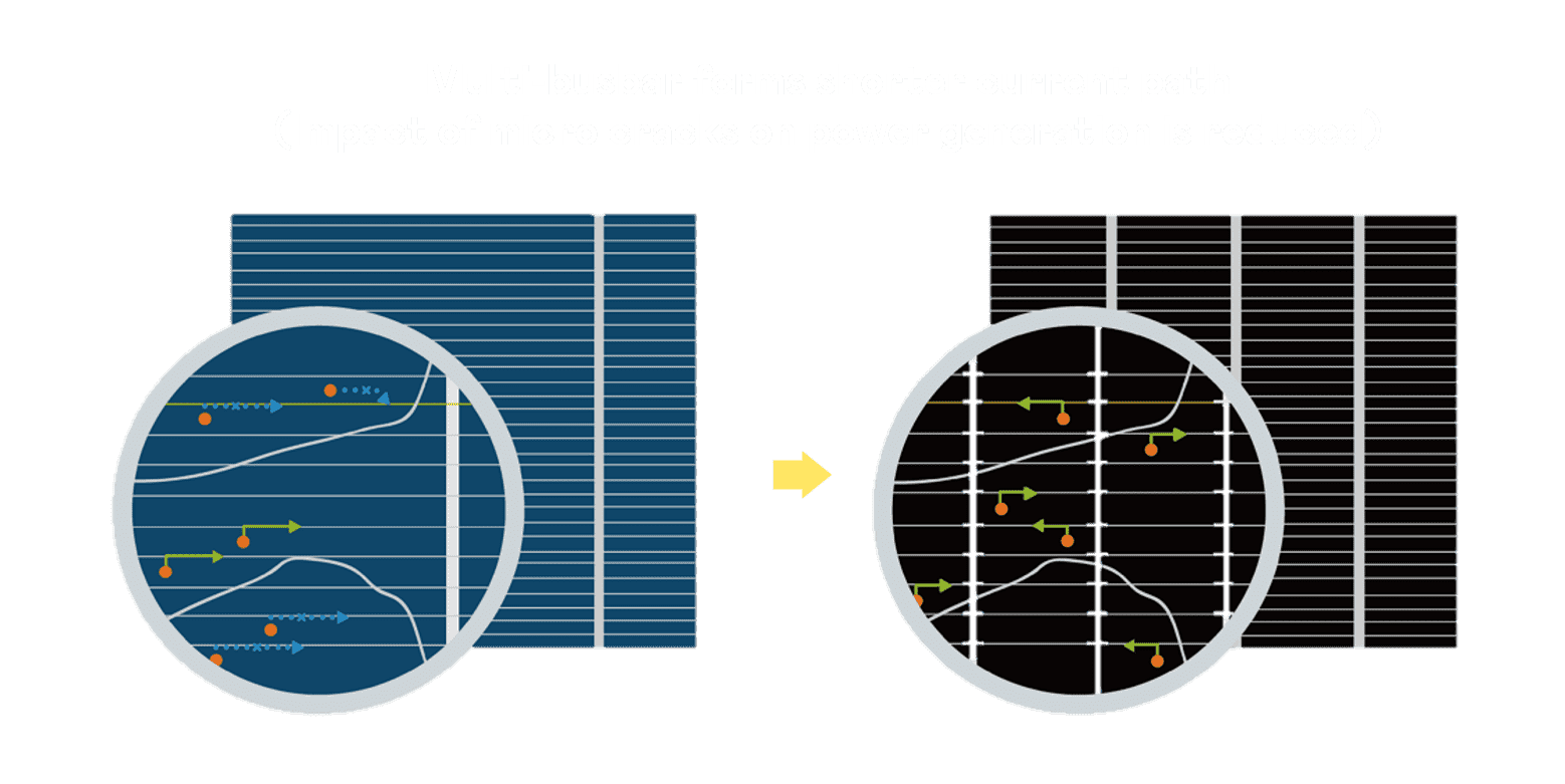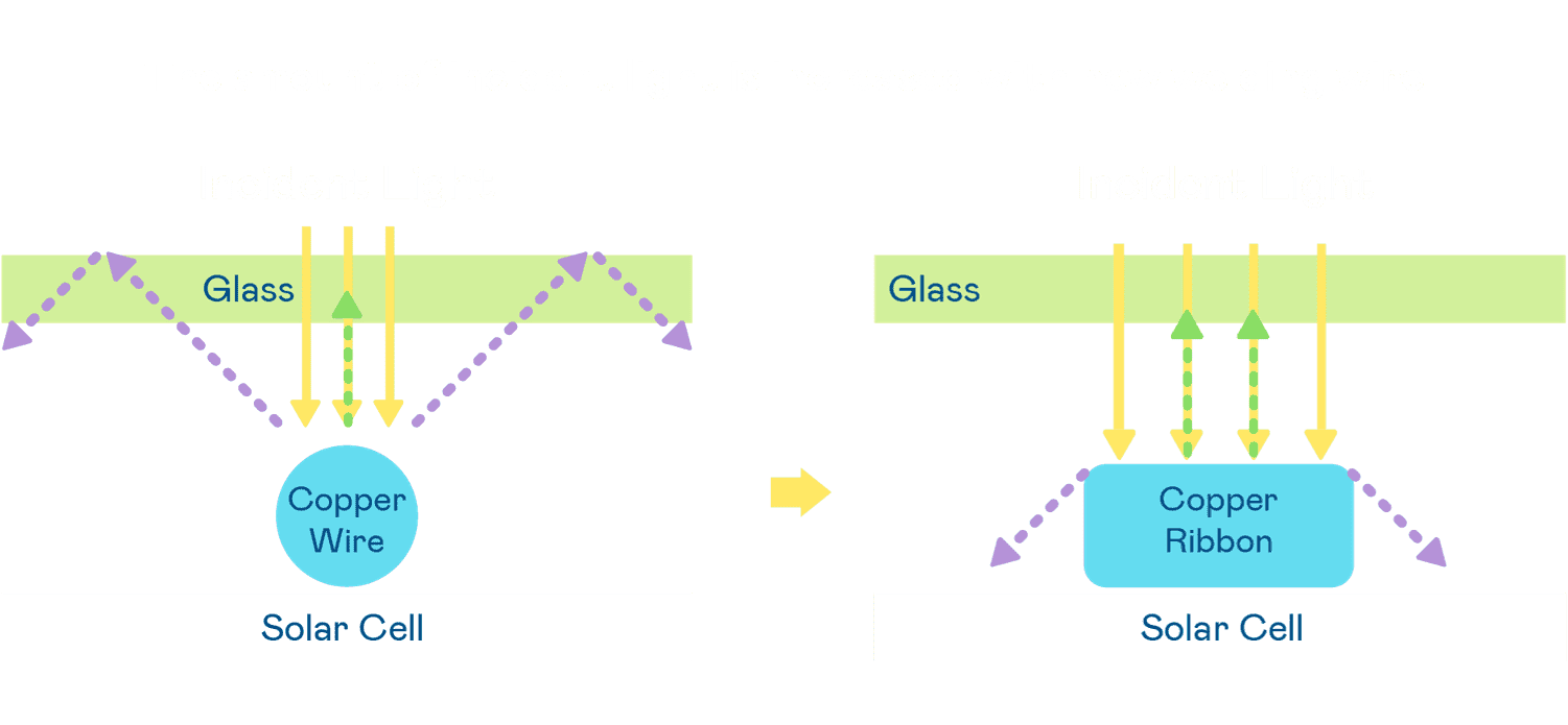 - 电池使用多条铜导线 (Copper wire) 于电池片上形成较短的电流路径,,,,提高电流收集效率,,,采用圆形设计的铜导线较传统扁平式的铜焊带 (Ribbon),,,可增加入射至电池的光线量。。。
