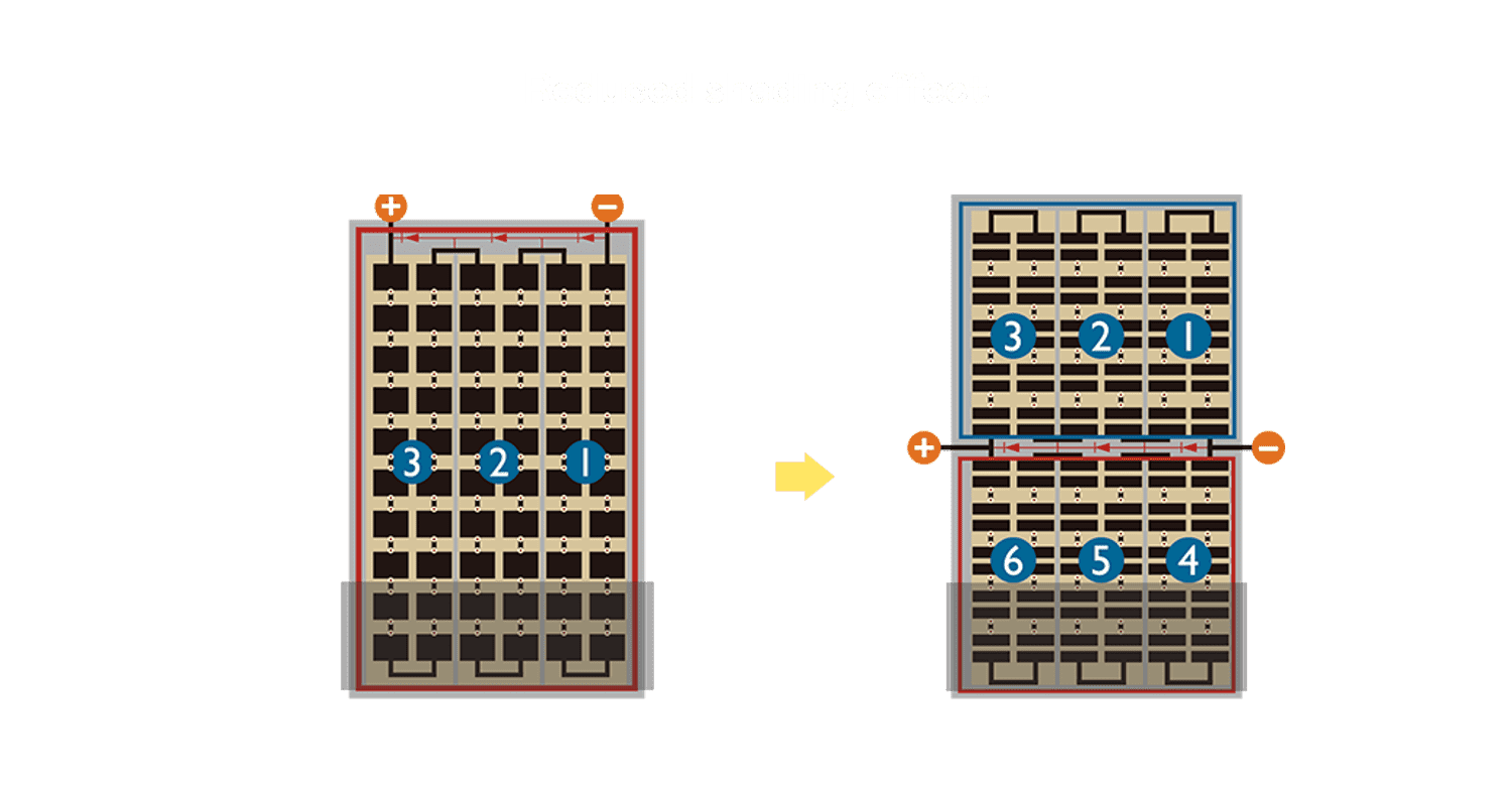 - 结合半切电池,,,降低遮阴影响、、提升模组抗隐裂能力、、、、并减少电阻损耗,,,,进一步提升模组发电效能。。